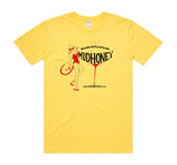 Mudhoney 'Los Playboys' design on a daisy yellow Gildan Heavy T-shirt with front and backprint. 100% cotton.